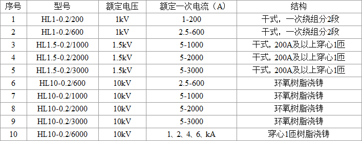 常用規(guī)格列在表6中。結(jié)構(gòu):1KV及以下為干式。10kV級(jí)為環(huán)氧樹(shù)脂鑄造式。用于組合式互感器中為油浸式。