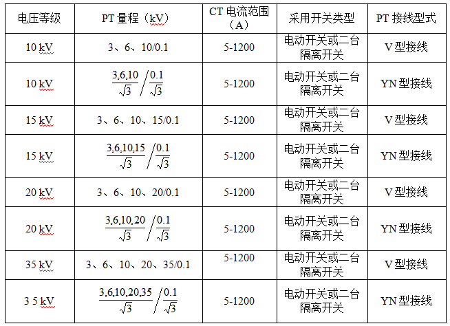 電機(jī)試驗(yàn)一般由3臺CT,2臺PT,V型接線組成,其電壓一般10kV,電流1200A以下,PT做成二次抽頭式的,CT也做成二次抽頭切換式的,高電流值/小電流值=K≤20,這樣可省去電動開關(guān),僅保留一個隔離刀開關(guān)即可,如K≥20以上,可將CT一次分為兩級,滿足測量電流跨度要求,這樣需要用2臺隔離開關(guān)即可滿足要求。