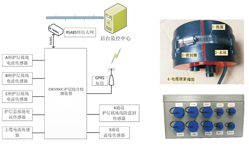 電纜護(hù)層環(huán)流在線監(jiān)測(cè)由IM5000C電纜護(hù)層綜合監(jiān)測(cè)裝置主機(jī)和電流互感器、溫度及防盜割傳感器等組成實(shí)現(xiàn)。開口式電流互感器安裝于電纜護(hù)層接地線上,經(jīng)轉(zhuǎn)換為二次信號(hào)后引入監(jiān)測(cè)裝置。溫度傳感器用于對(duì)電纜溫度進(jìn)行監(jiān)測(cè),防盜割傳感器對(duì)環(huán)流接地線進(jìn)行盜割監(jiān)測(cè)。電纜護(hù)層綜合在線監(jiān)測(cè)系統(tǒng)組成如下圖: